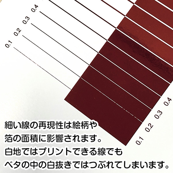 その性質上、細い線は掠れたり箔が乗らなかったりしますし、 細かい模様はつぶれやすいです。