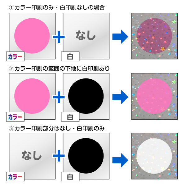 白の使い方・工夫次第では絵柄をはっきり表現することはもちろん、白を入れずに絵柄を透かしてホログラムを浮き上がらせることもできます!