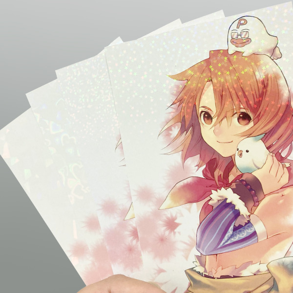 スマートホログラムは、フィルムを使わず絵柄を邪魔しない、でもしっかりキラキラが見える加工です。