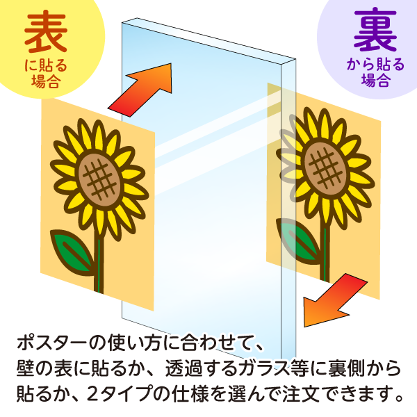 ①【裏面吸着】〈正像印刷〉 壁などに貼る、普通の使い方をする場合はポスターの裏側に吸着面(剥離紙)が来るように印刷します。