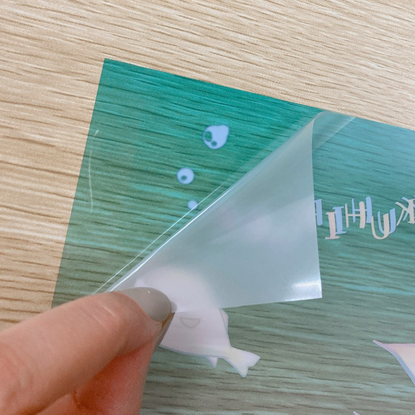 ②【表面吸着】〈逆像印刷〉 屋内からガラスなどに貼り、屋外に絵を見せたいときには絵の表面に吸着面(剥離紙)が来るように印刷します。