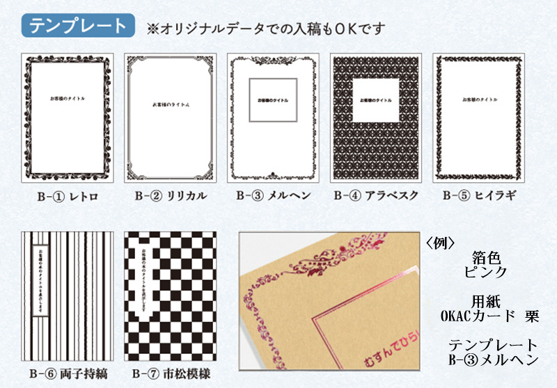 オリジナル箔プリントオプションでご利用いただけるテンプレートを7種類からお選びください。