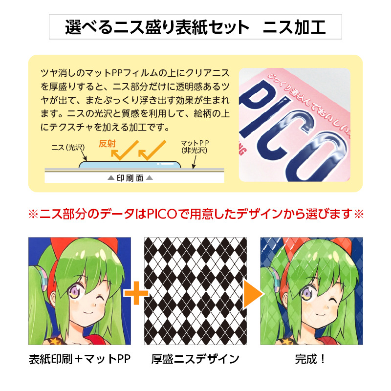 お好きなデザインを選択するだけで、そのデザインのニス盛りが加工されます!